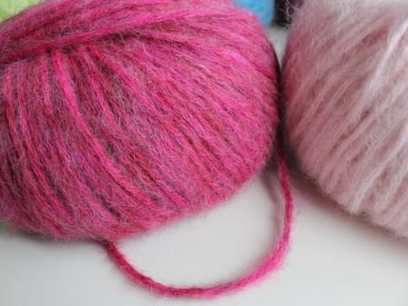 色の細い糸を、リリヤンぽく撚って、まわりを白っぽいホワホワが